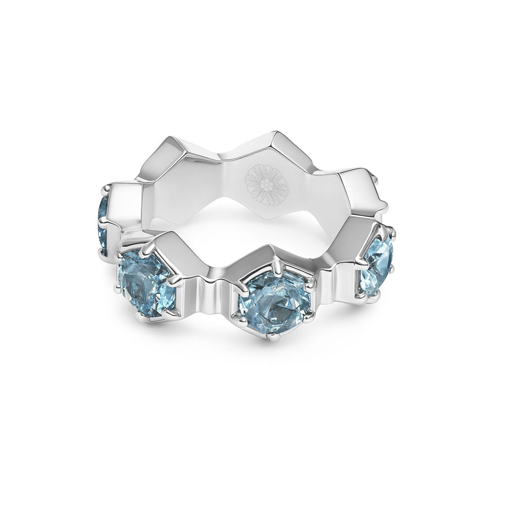 The Apis Eternity Ring pays tribute to Apis, the sacred symbol of strength, renewal, and harmony in Roman culture. Handcrafted in polished sterling silver, the design features a continuous circle of gemstones, representing infinity and everlasting beauty. Available with either luminous aquamarines or radiant citrines, each gemstone variation tells its own story: aquamarine evokes serenity, clarity, and the tranquil flow of water, while citrine radiates warmth, joy, and golden vitality. Together, they embody dual expressions of balance—calm and energy, reflection and light. The Apis Eternity Ring is a modern talisman, celebrating both elegance and symbolism in a timeless form.